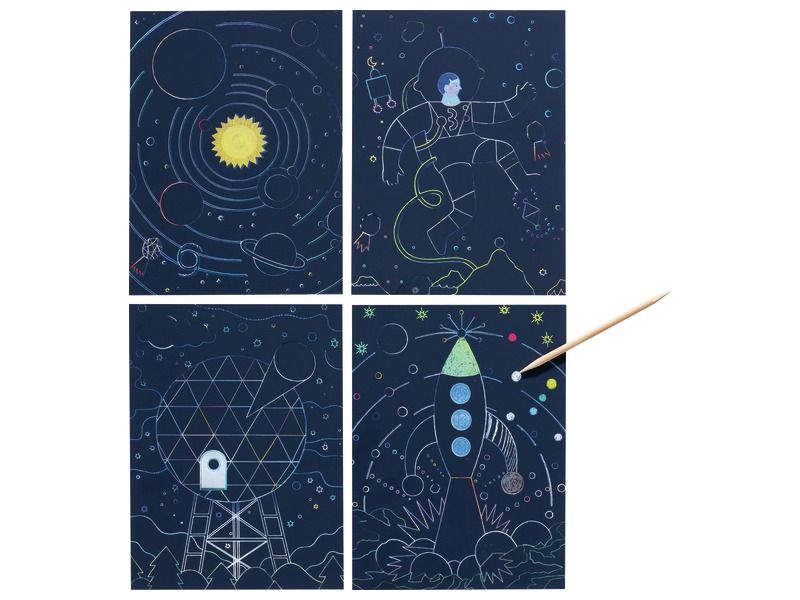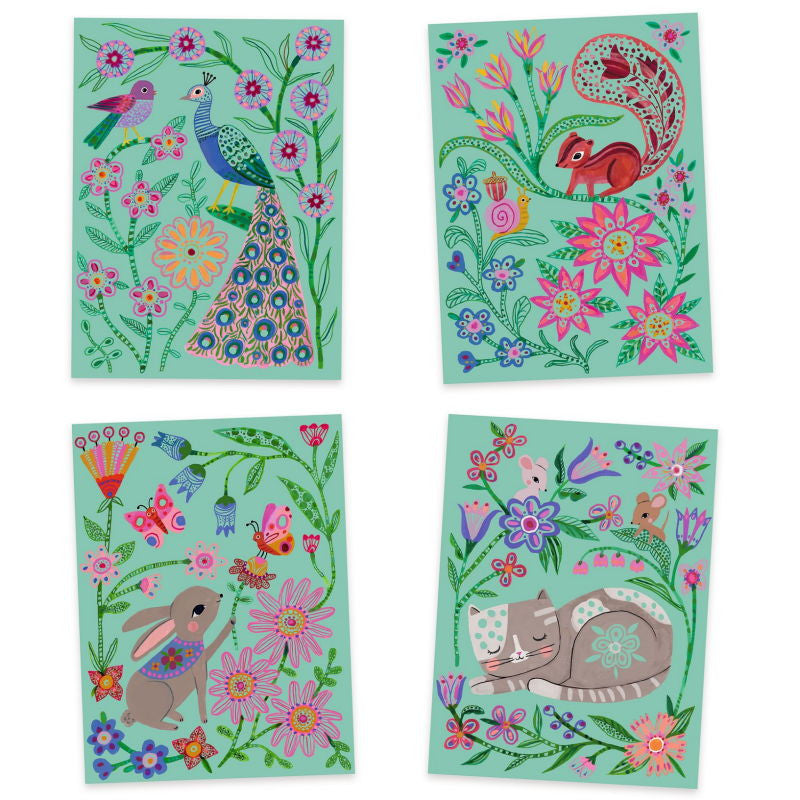 La pochette contient 4 cartes à gratter, un stylet en bois et un livret explicatif.