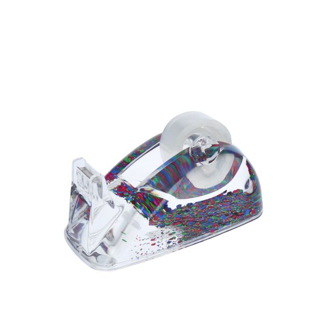 Un dévidoir de ruban adhésif transparent à paillettes bleues, rouges et vertes.