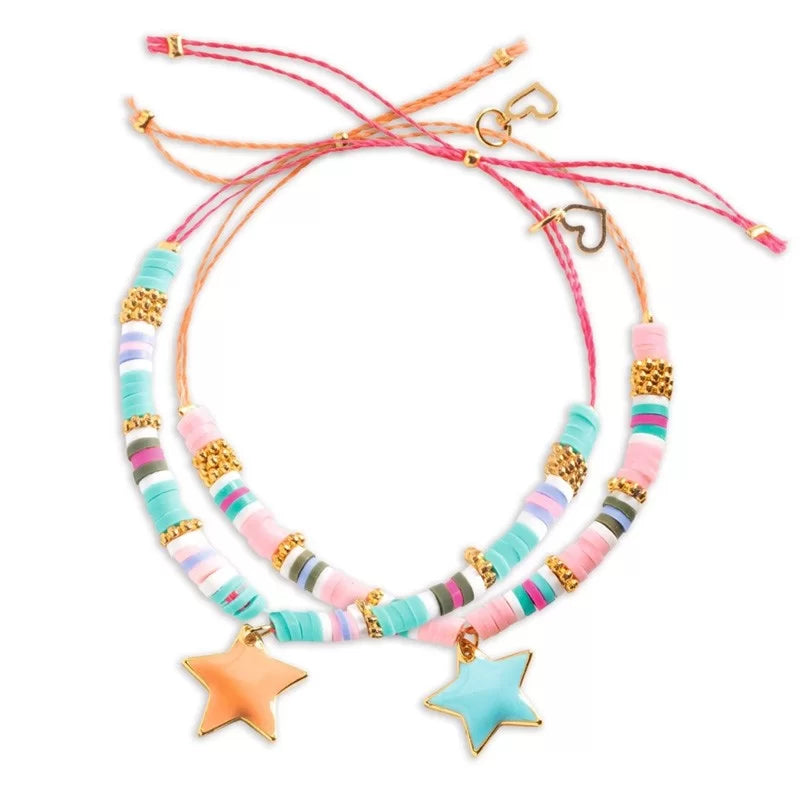 À faire seul ou à deux, pour offrir ou pour soi, le kit Heishi Etoiles contient tout un assortiment de matériel pour réaliser deux jolis bijoux. Dès 7 ans.