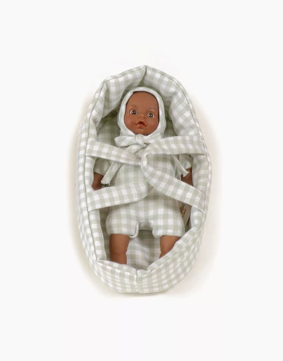 Minis – Pio aux yeux foncés et son couffin Vichy vert de gris