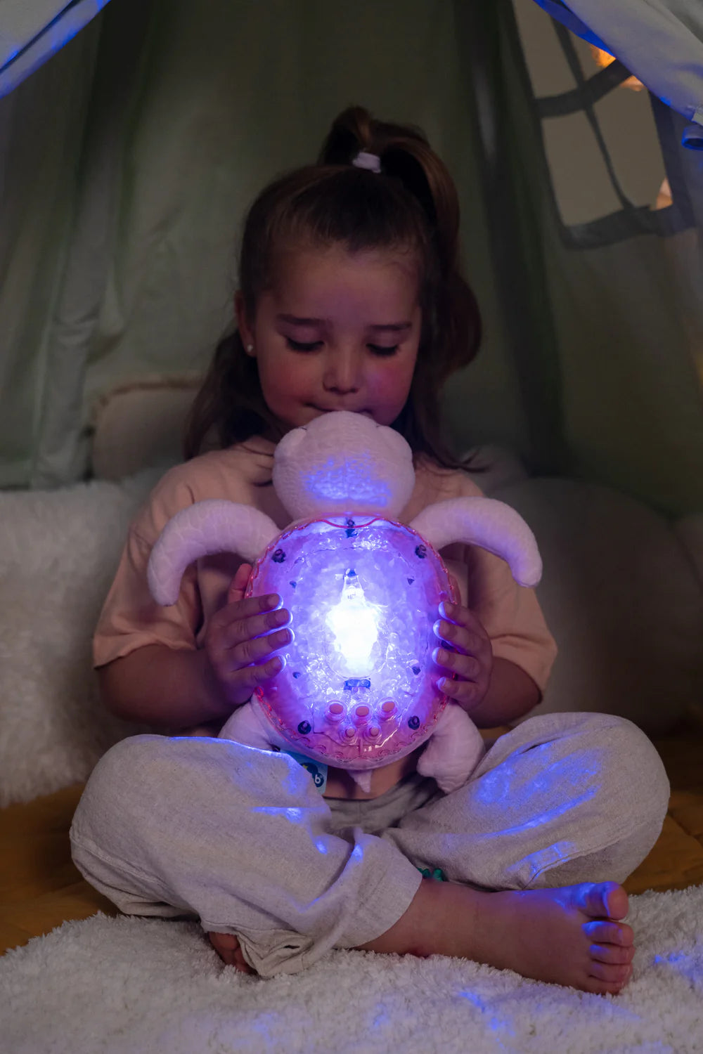 La veilleuse Tranquil Turtle™ apaise bébé dès sa naissance et rassure les enfants qui ont peur du noir. Douce peluche la journée, elle se transforme en veilleuse la nuit venue. Une mélodie marine et le son des vagues (bruit blanc) apaiseront bébé pour un sommeil relaxant. Son effet de lumière sous-marine est magique grâce aux projection de vagues en mouvements.